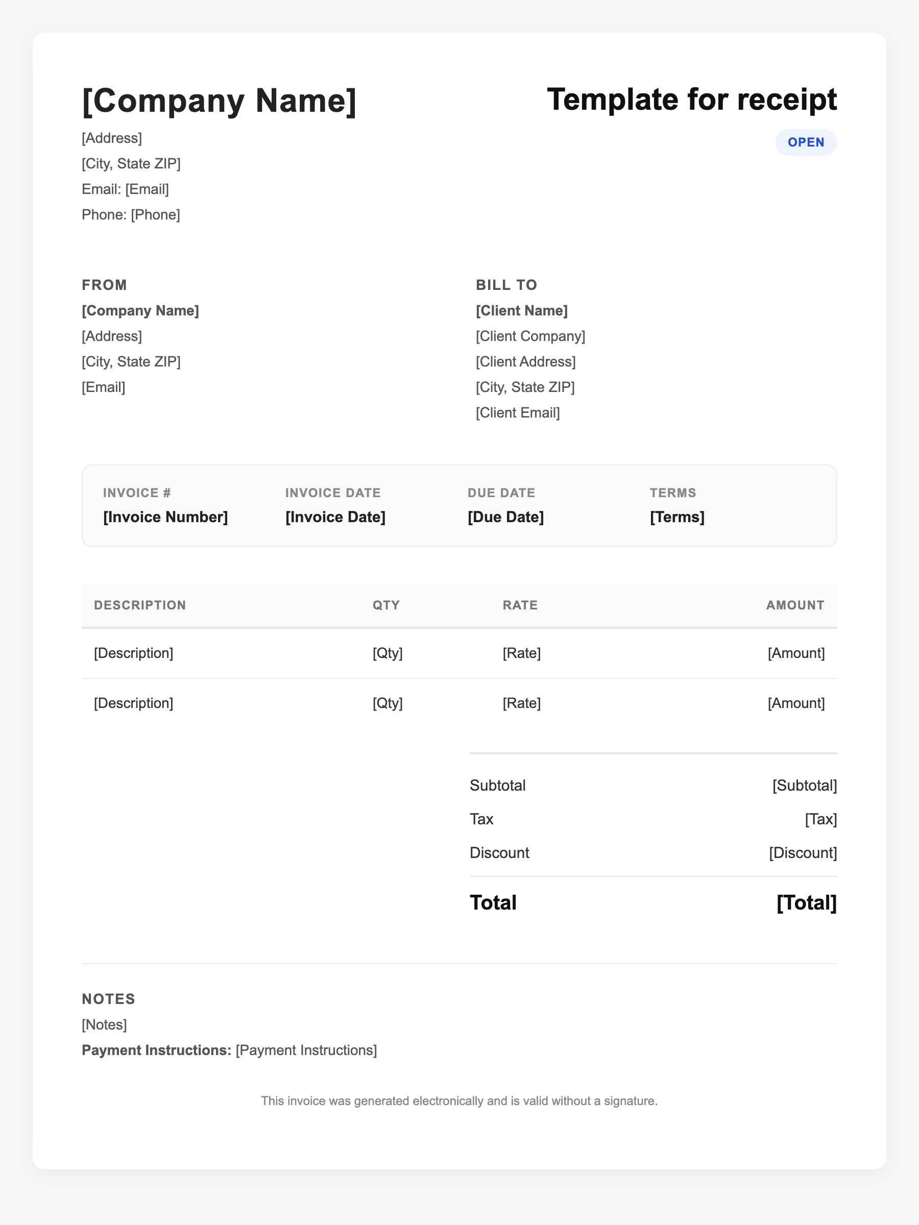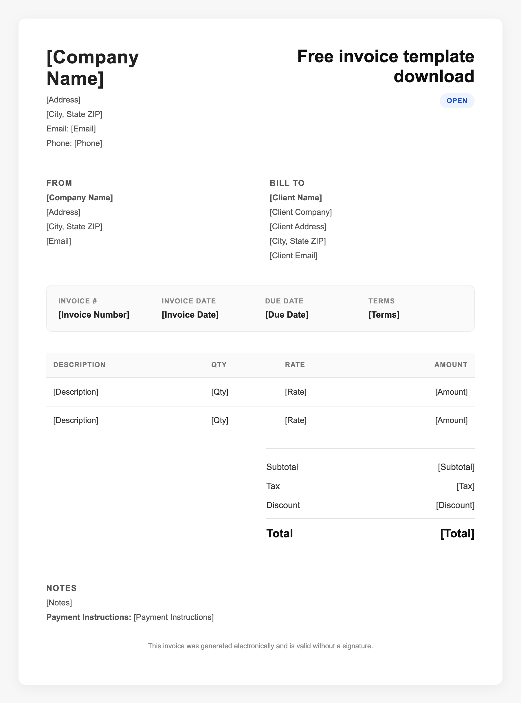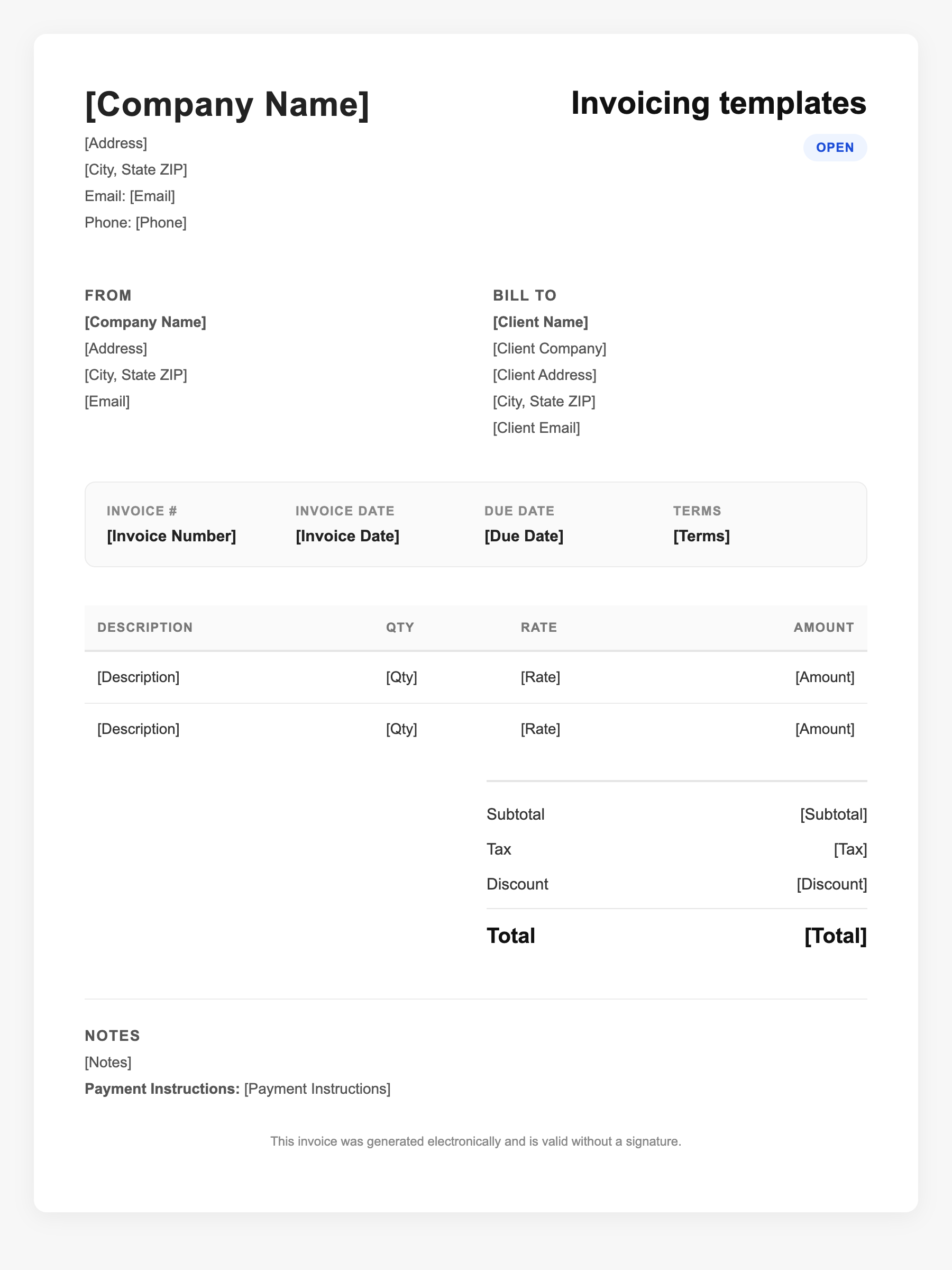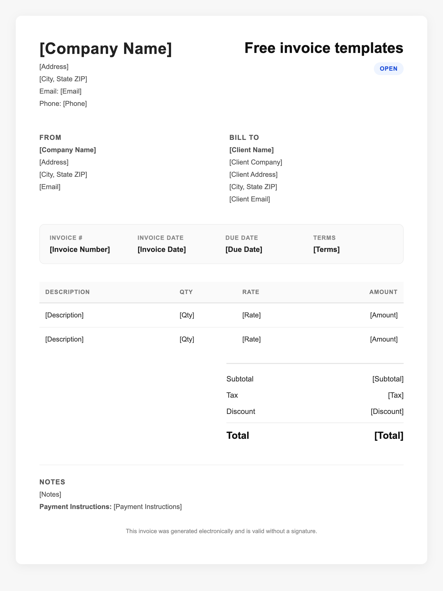 Free invoice templates for Word, Excel, and PDF. Download or use our online invoice builder.